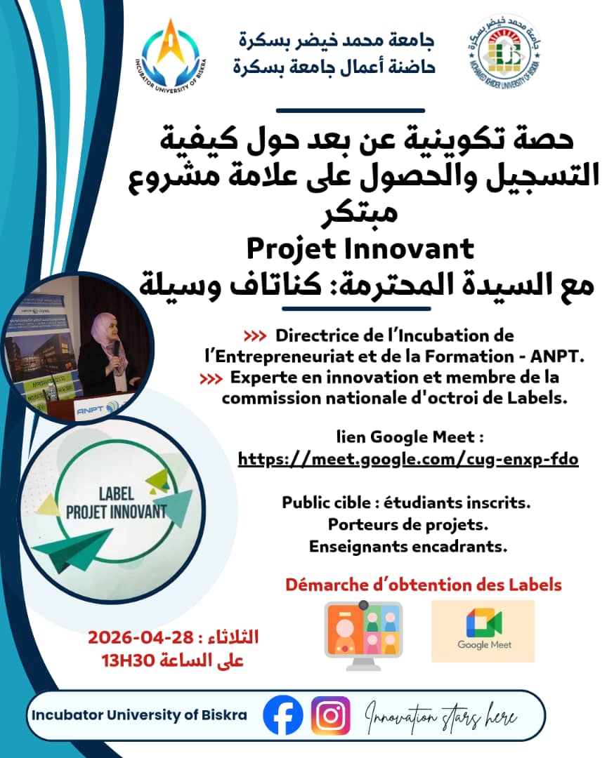 دورة تكوينية عن بعد حول : التسجيل والحصول على علامة مشروع مبتكر( Label Projet Innovant). من تقديم الأستاذة المحترمة: كناتاف وسيلة. مسؤولة الابتكار والمقاولاتية للوكالة الوطنية للحضائر التكنولوجية، خبيرة في الابتكار وعضو اللجنة الوطنية لمنح الوسم.