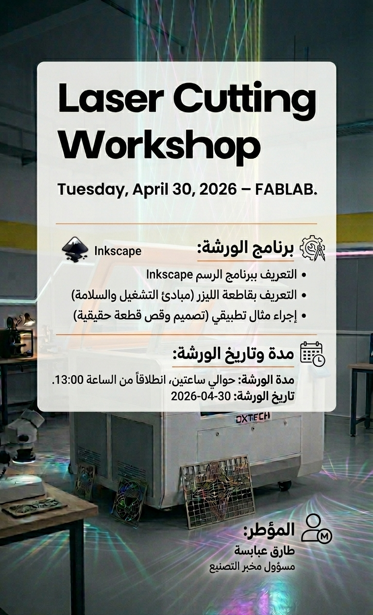 في إطار تمكين الطلبة من الإستفادة من آلات مخبر التصنيع فإنه تقرر برمجة ورشة تصنيعية باستعمال آلة القطع بالليزر (La Découpe Laser) التي تدعم بها مخبر التصنيع مؤخرا.